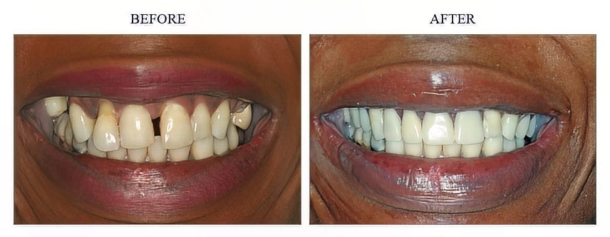 This pretty woman suffered from periodontal (gum) disease which gradually caused her teeth to drift and ruined her smile. Her gum disease was able to be treated without surgery, but unfortunately, we had to remove 3 hopeless upper front teeth. She was never without front teeth to smile with because we placed a temporary “flipper” at the very same appointment the 3 teeth were removed. Her final restoration included just 2 crowns with precision attachments so that her removable partial denture was able to be stable and retentive without unsightly metal clasps or hooks. She is very happy with the improvement and quite comfortable with her precision attachment (claspless) partial denture.