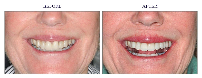 She was very reluctant to restore all her upper teeth, so we decided on a minimal treatment plan and got terrific results! We ended up bleaching all her teeth and simply remaking three porcelain crowns for her 2 front teeth and an upper back molar. The only additional treatment was two veneers on 2 upper side teeth to “widen” her smile.