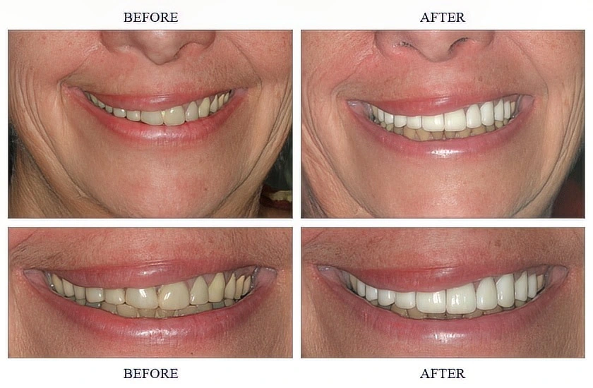 Cathy, from West Bloomfield, is a wonderful and kind woman that had composite (plastic) veneers placed on her front teeth many years ago to cover up teeth that had been badly discolored as a result of having been prescribed Tetracycline as a child. Although those first veneers were a dramatic improvement over the gray/brown discoloration from the tetracycline staining, they were very opaque and over the years the plastic had worn, stained and chipped to the point that she was again unhappy with her smile. We focused on the upper teeth and first had her visit an excellent periodontist who helped take care of her swollen and irritated gums. We then did a combination of all porcelain E-Max veneers and crowns on her 10 upper front teeth. We chose E-Max for its strength and durability (she had quite a bit of tooth wear) and chose a bright, “no-compromise” color for the uppers, assuming we will eventually do the lower teeth also to match. The restorations were done in 2 appointments and the results speak for themselves. Her “bite” is very comfortable, free of sensitivity and no adjustments have been needed since they were placed. She and I couldn’t be happier and her gums look great, too! What a difference!